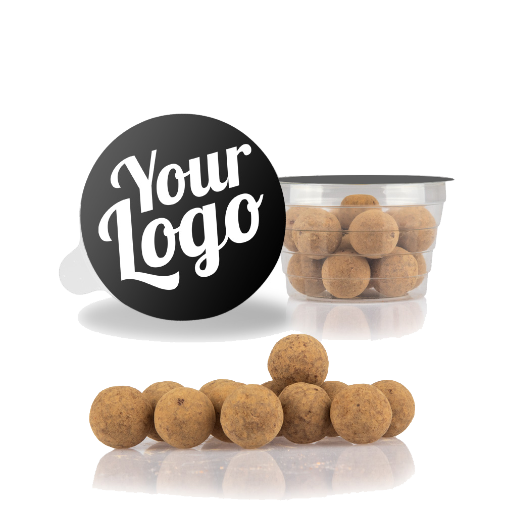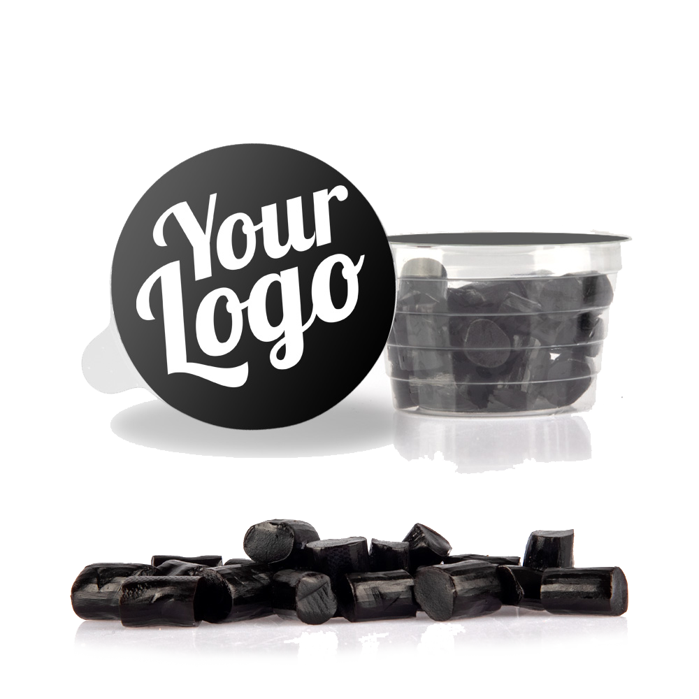 Lækre chokoladelakridskugler i elegant snackbæger med dit logo på låget. En eksklusiv gaveidé med masser af smag og brandingværdi.