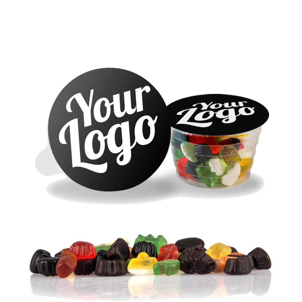 Farverig slikmix med både vingummi og lakrids – leveret i praktisk snackbæger med dit logo på låget. En lækker og festlig firmagave.