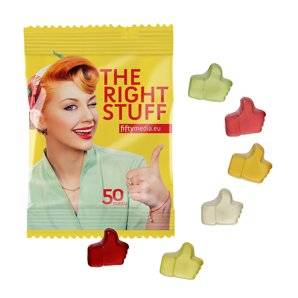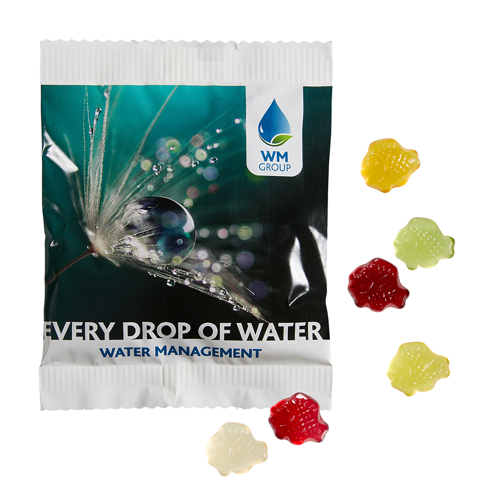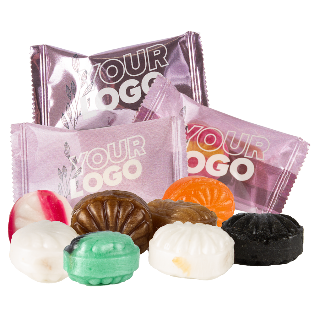 Klassiske enkeltpakkede bolsjer med dit logo på emballagen. Perfekt til receptioner, mødelokaler og events, hvor branding og smag går hånd i hånd.