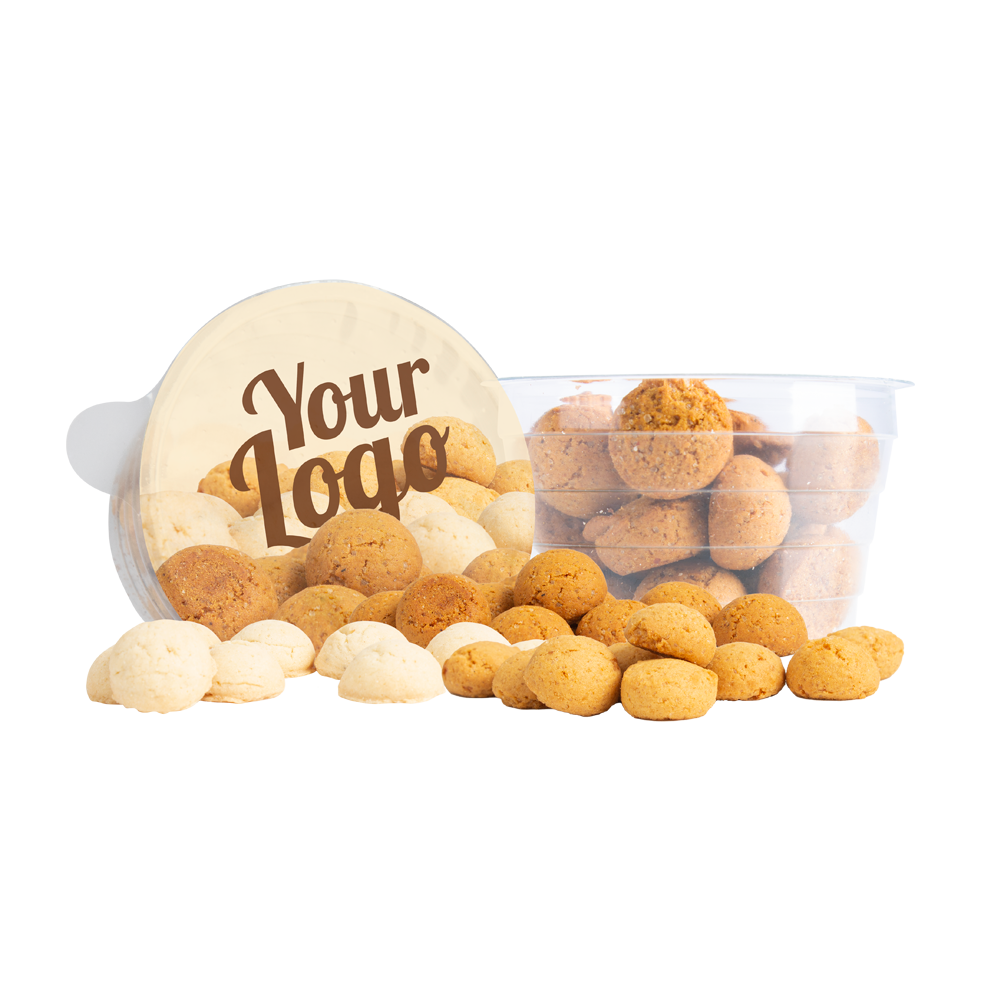 Knasende pebernødder i et gennemsigtigt bøtte med dit logo på låget – en julet klassiker, der smager godt og spreder hygge.