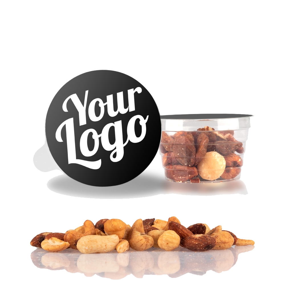 Sprøde og saltede nødder serveret i et gennemsigtigt snackbæger med dit logo på låget. Perfekt til mødebordet, messer og firmagaver med smag.